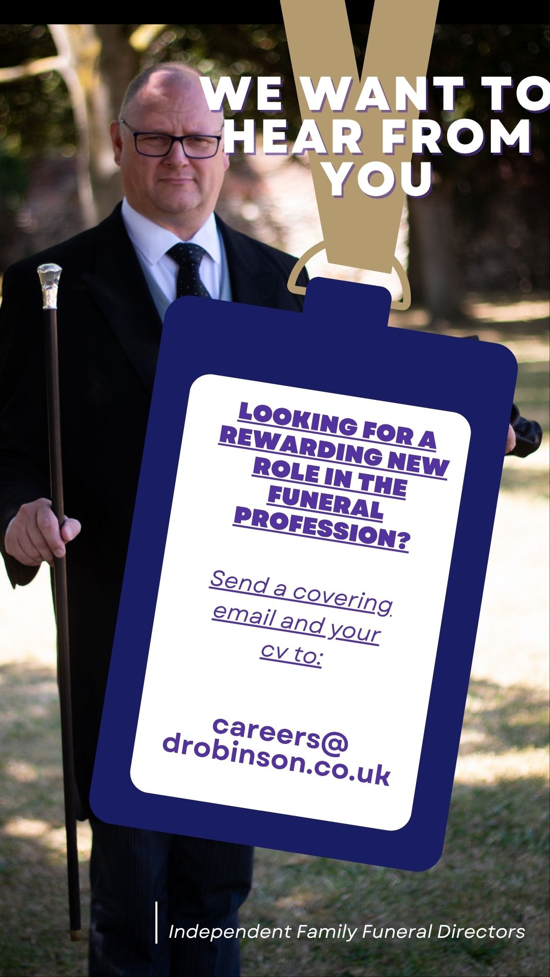 If you have previous experience, are looking to relocate or, are interested in moving into the funeral profession, please email your C.V. with details of the type of work you are looking for to careers@drobinson.co.uk, or fill in the above enquiry form.